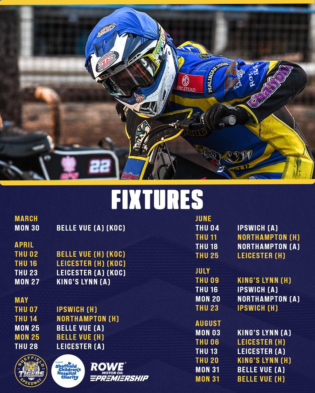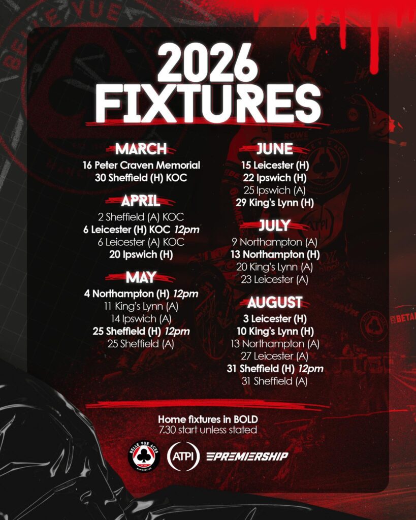 Belle Vue and Sheffield also race Bank Holiday doubles in both May and August, whilst the opening league match at Northampton is on Thursday May 21 when they face Leicester.