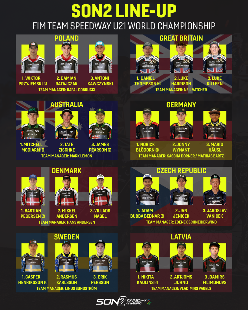 Poland’s challenge is led by 2024 FIM Speedway Under-21 world champion Wiktor Przyjemski, who is chasing his fourth SON2 gold medal in as many years. He teams up with 2023 SGP2 runner-up Damian Ratajczak, with Torun’s own Antoni Kawczynski named as their No.3 on his home track.